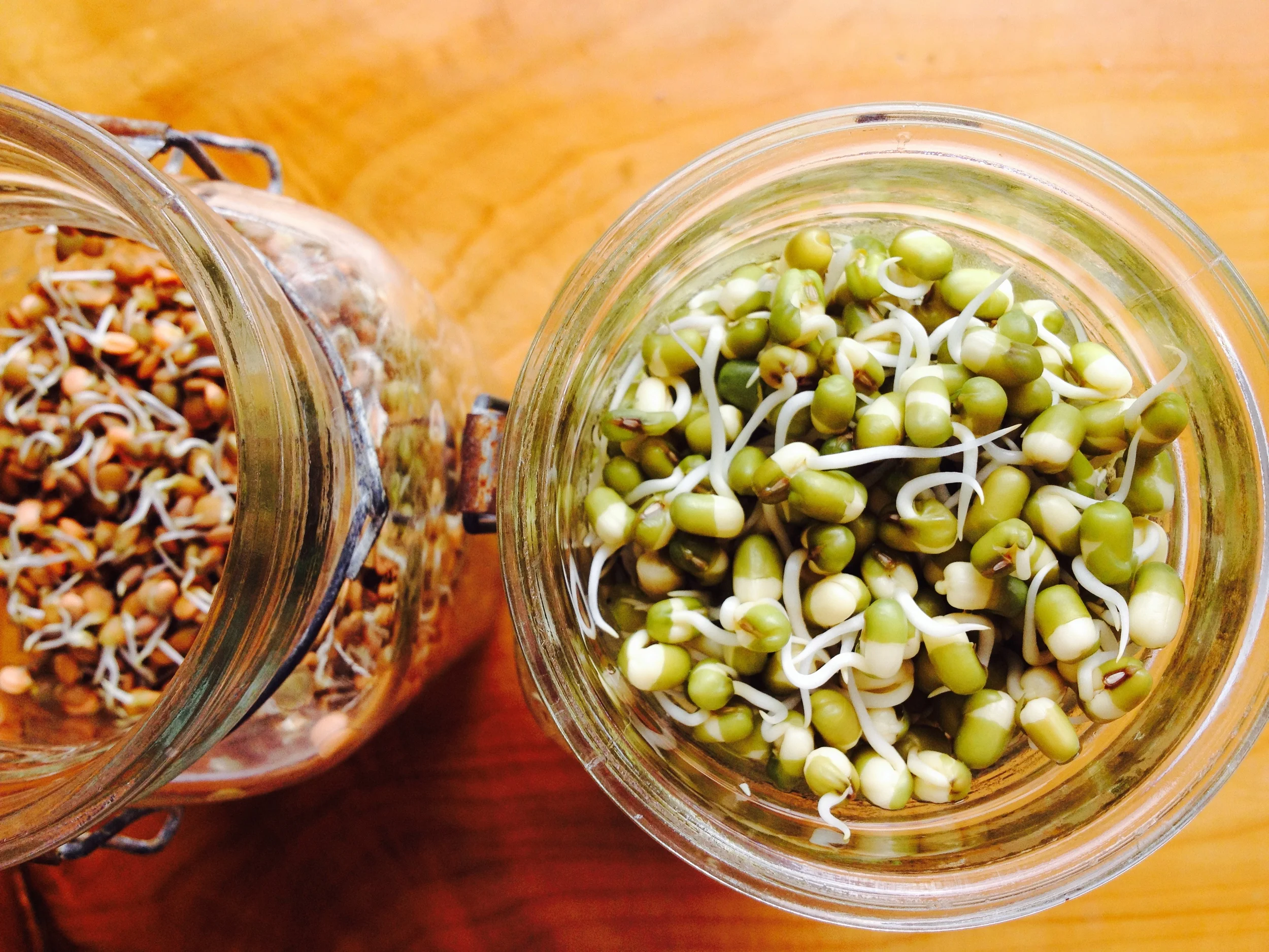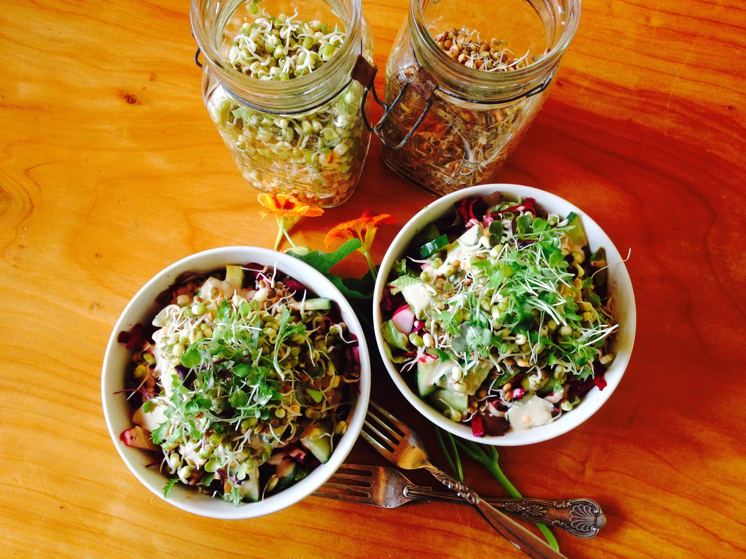 Sprouting is easy, mung beans, brown lentils and buckwheat are delicious sprouted for salads, and so many other yummy things. Just soak in a jar overnight, drain in the morning and remember to rinse and drain morning and night until sprouted, only a day or two. So much cheaper and fresher than buying sprouts in the supermarket, and so incredibly great for you. Build a giant, crunchy, hearty salad meal with whatever fresh veg you have on hand and top with a nutty dressing, tahini, lemon, apple cider vinegar. Or peanut butter, fresh ginger, lime, braggs (soy).