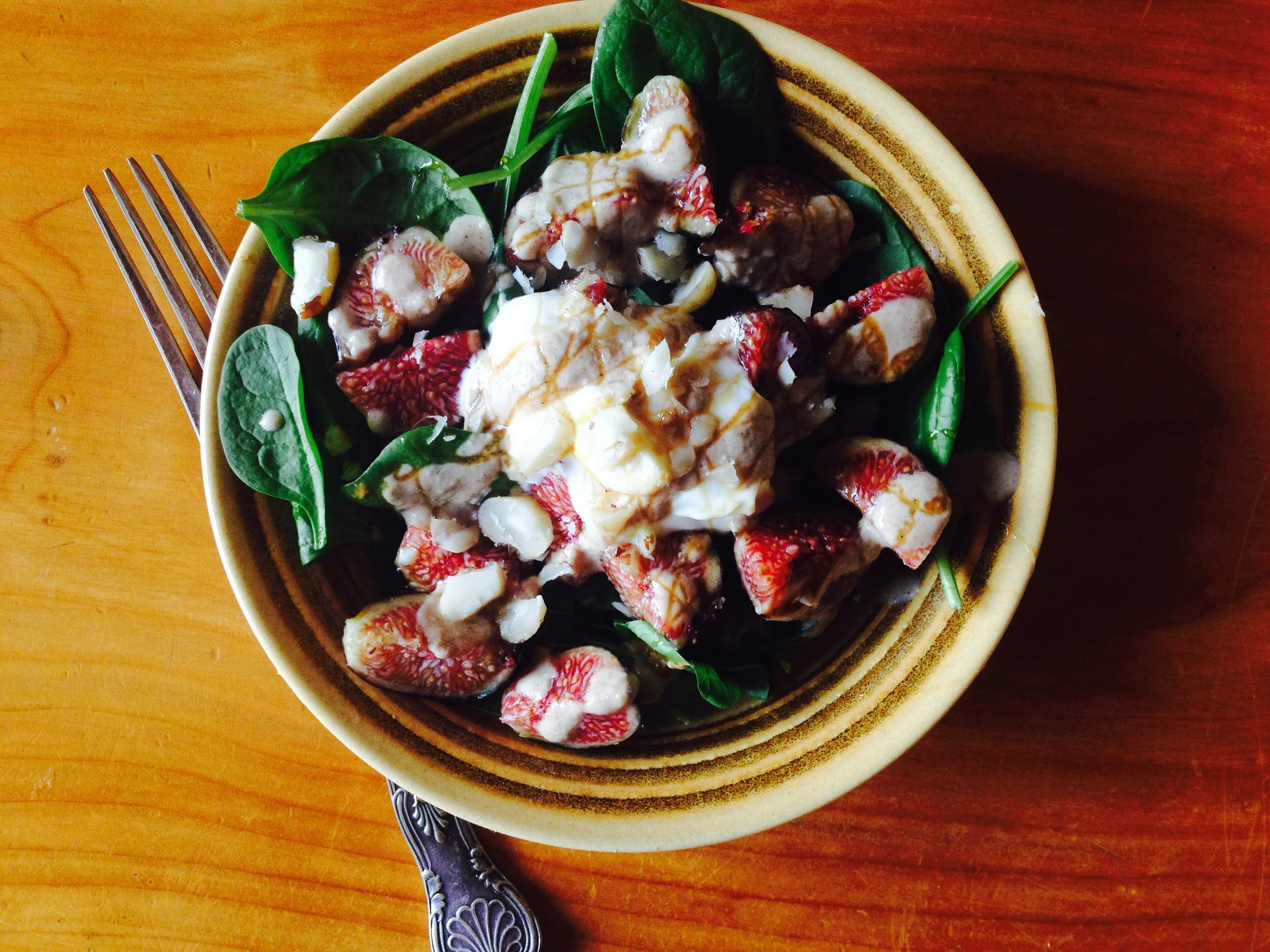 Layer fresh figs quartered on a bed of baby spinach, or rocket would be nice too, dollop on a big spoon of yoghurt, drizzle over a small amount of tahini and honey and sprinkle a couple of chopped brazil nuts on top. Healthy and decadent breakfast heaven.