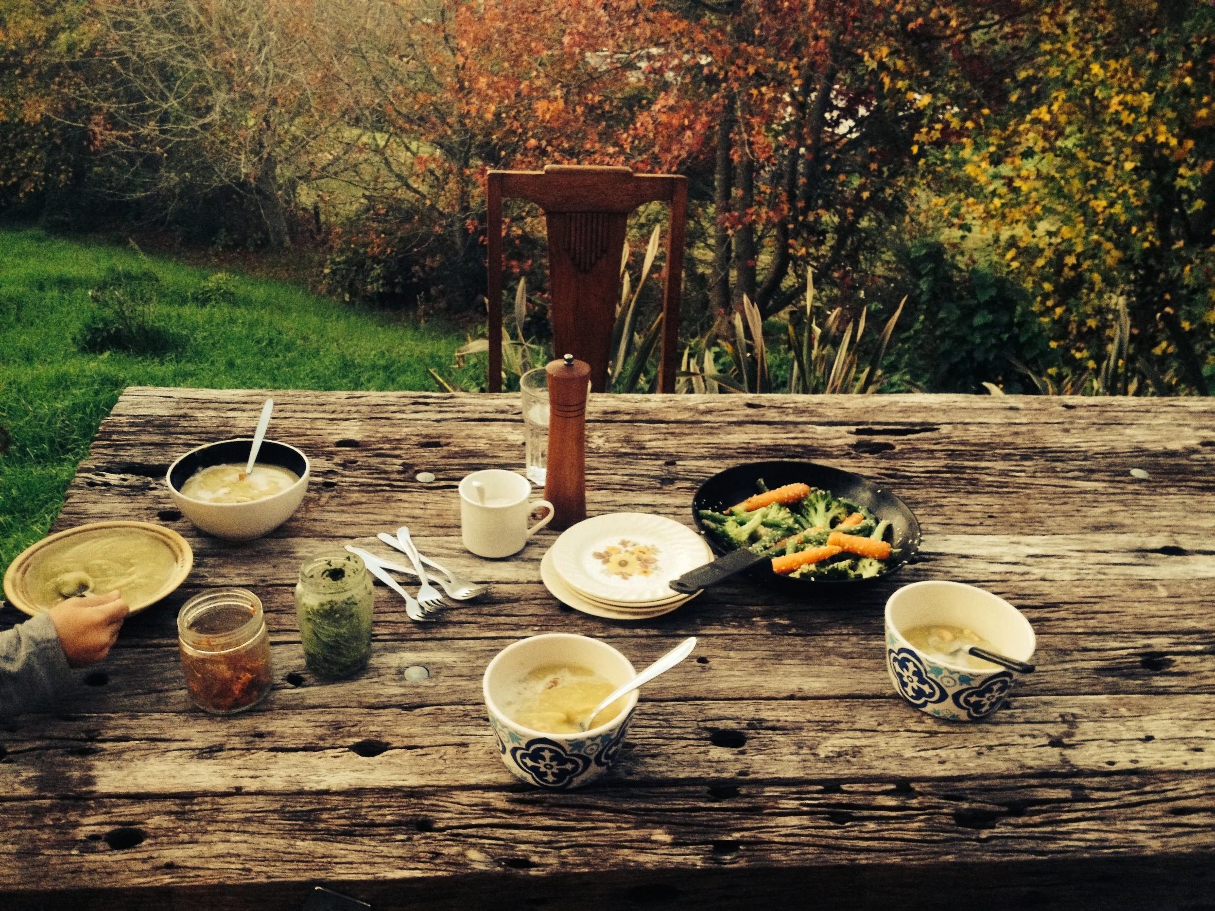Autumn lunch of Warming Dal, veges and homemade red and green pestos.