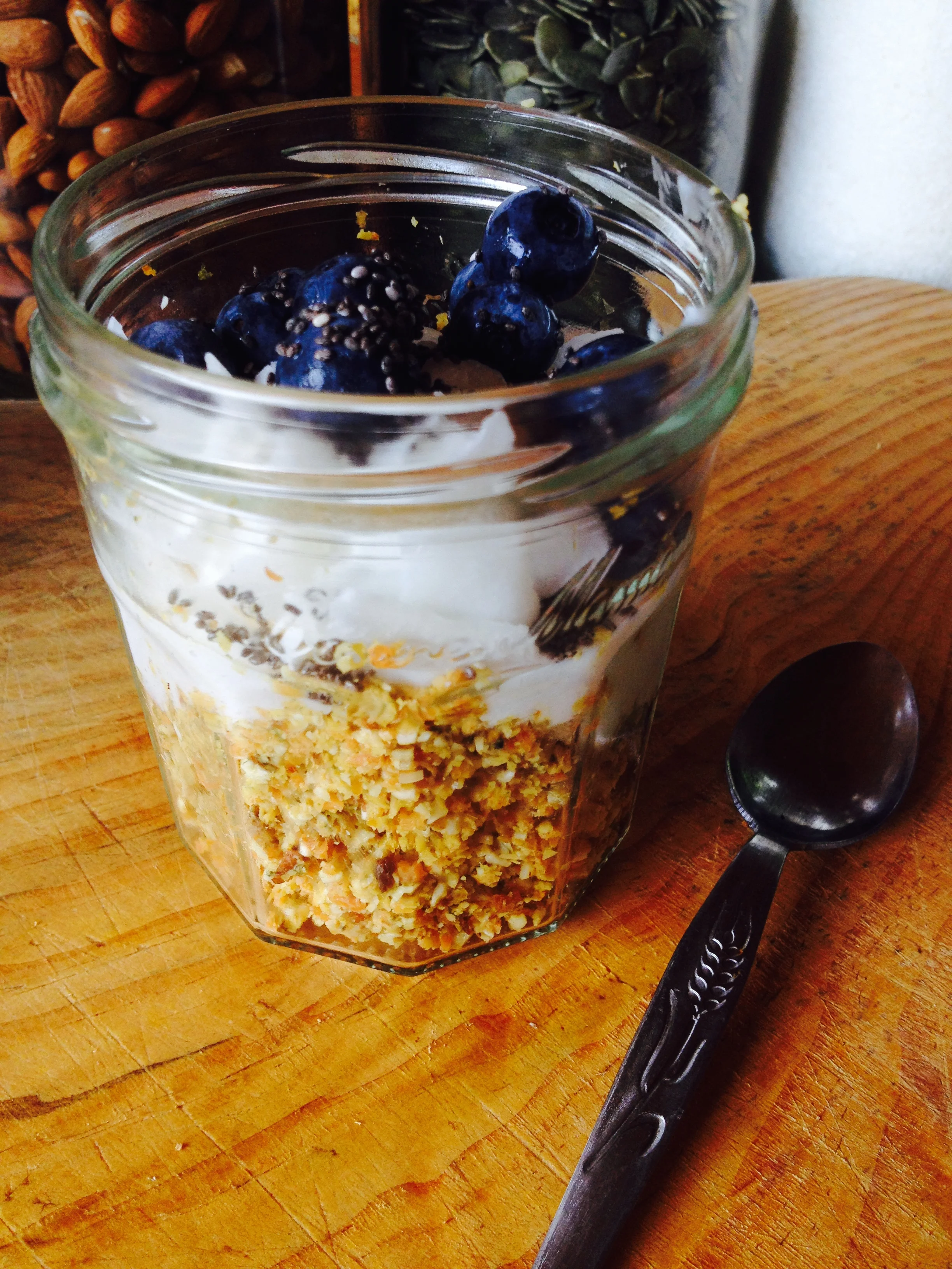 We like this topped with homemade coconut yoghurt, coconut chips, chia seeds, chopped bananas and blueberries. It's a great breakfast on the go, eat it out of jars on the way to the beach!